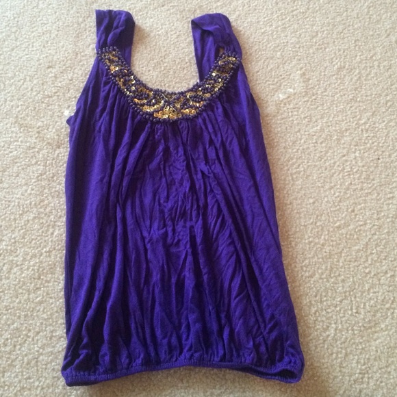 Purple with gold and purple beading around the neck. Flowy but tight at bottom. Good condition.