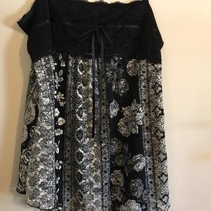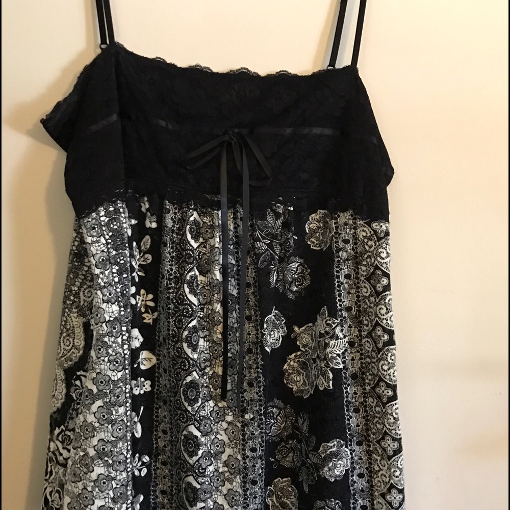 Black and white tank with adjustable straps and lace detail.