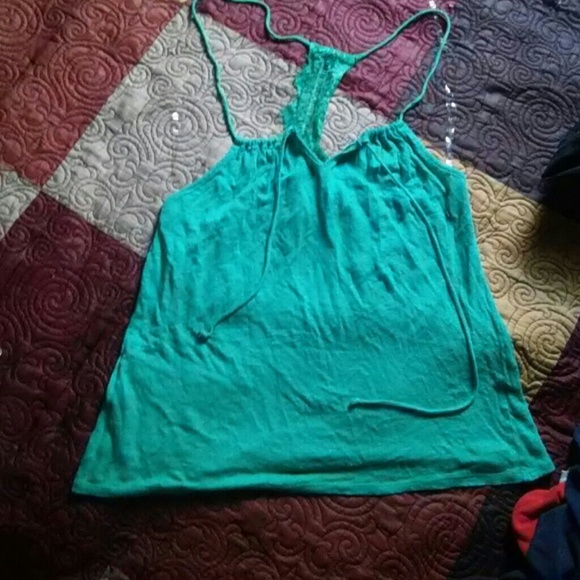 Green strappy shirt with pretty design in back 2 strings in front can tie however you like. Wore it 1 time very thin material