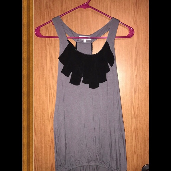 Charcoal gray with black neck detail, band at bottom of shirt. size small. Only worn a few times. Excellent condition.