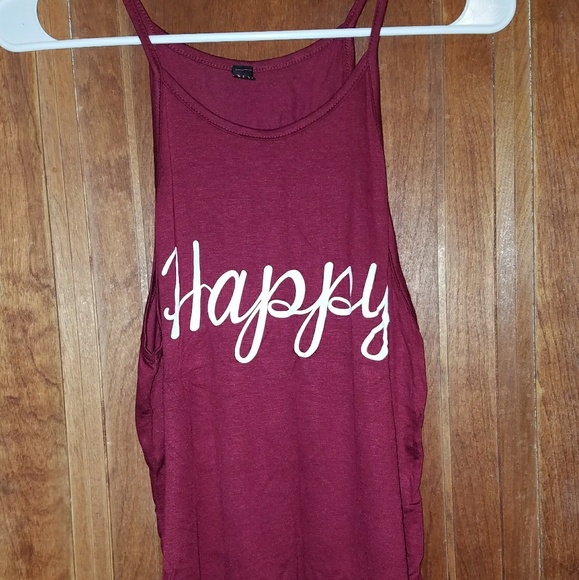 Skinny strap tank with Happy saying on front and "do what you love love what you do" on back. Maroon