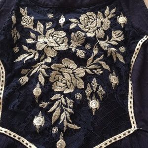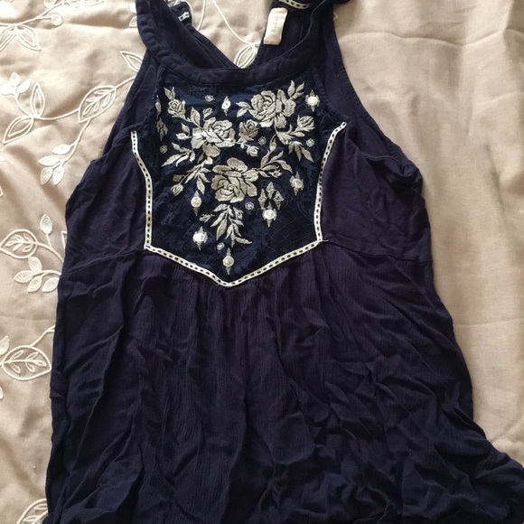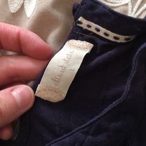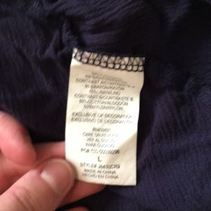 Worn and washed twice. A little smaller, would fit medium best. Navy color.