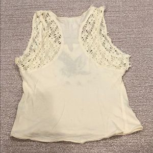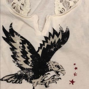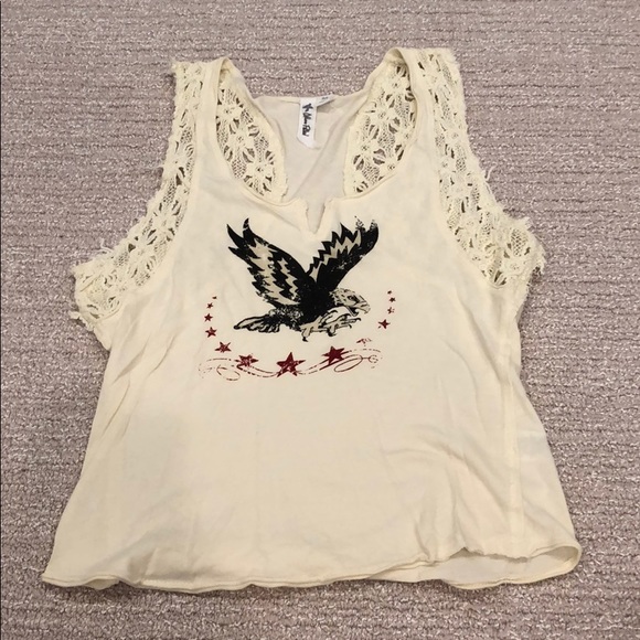 Trendy tank with a bald eagle on the front and crochet like stitching on the sides.
