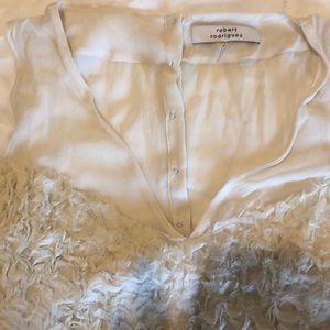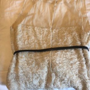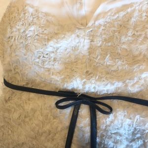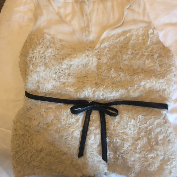 Ivory , grayish has a leather belt the top portion has a shear ivory part while the bottom looks like it’s bunched up . Works great with a skirt or jeans for a night out