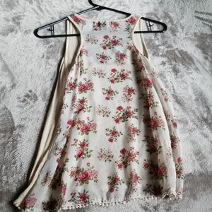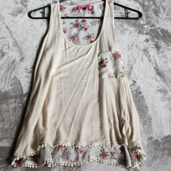 Adorable cream flowy tank. Has floral pocket detail, cute lace along the bottom. High front long back. Solid floral backing. Super stretchy and comfy. Worn but not abused. One stain pictured- from fabric softener.