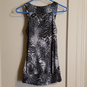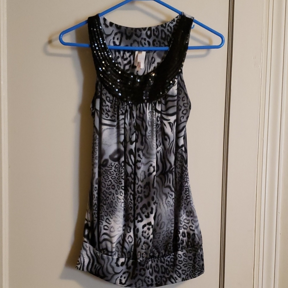 Black and gray leopard print dress tank with sequenced neck line