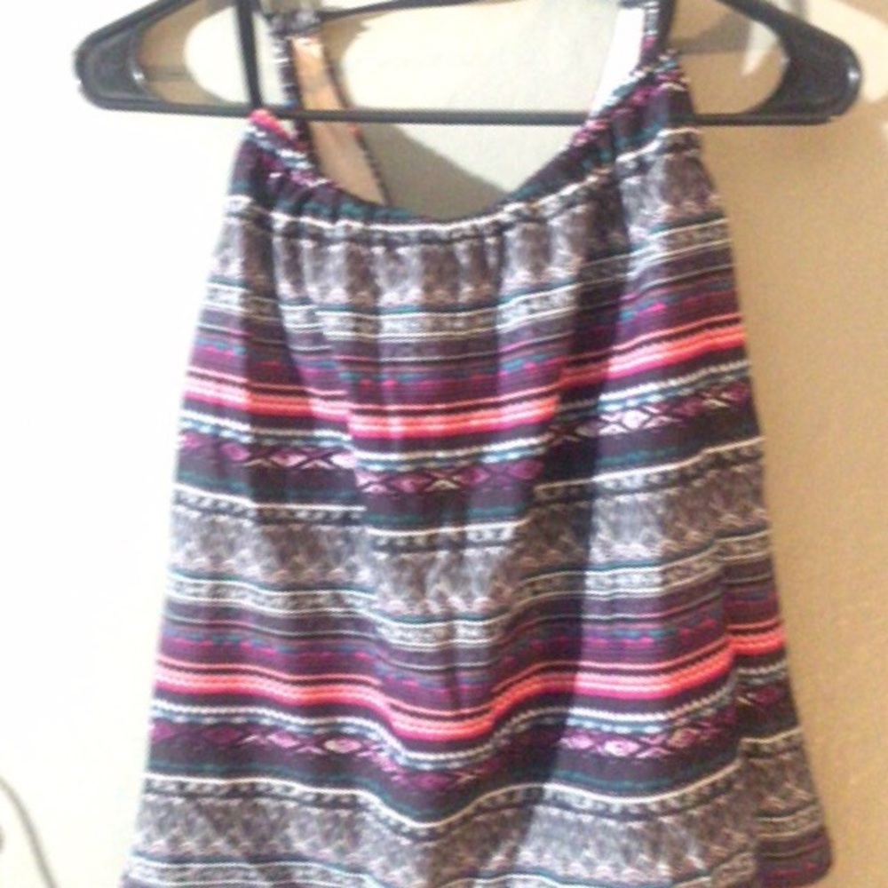 Woman’s tank ... can be worn casual or dress it up SEXY!! Size med (w/ inner bralette lining) various creative pattern in color ... perfect w/ blue jean pants or shorts even black leggings would look great with this fun active tee/ blouse with gathered rope string going around neck and connect to back.