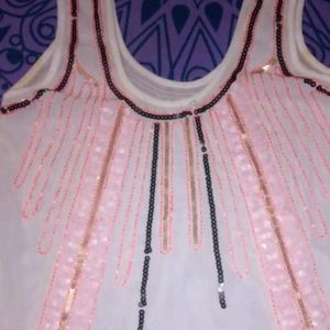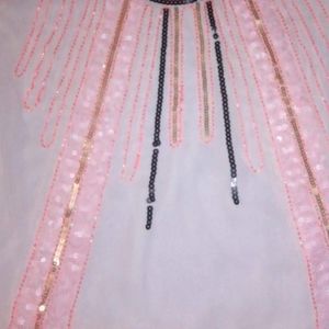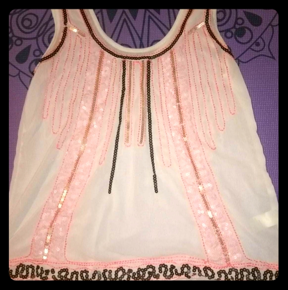 Sheer white tank top with gold, black and pink sequins. Some yellowing under arm pits over all great condition!