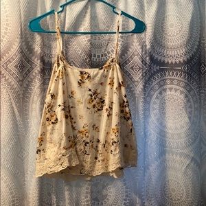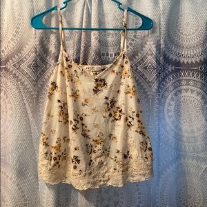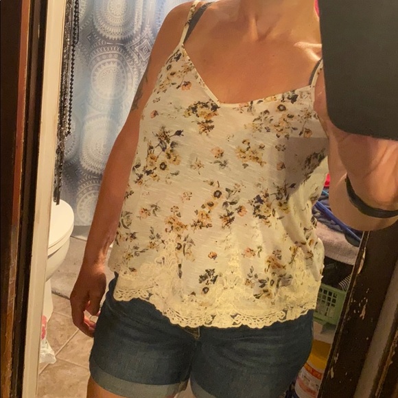 Jolt flowery tank has adjustable straps and lace embellishments. Pit to pit 17” Pit to hem 13” Across hem 23”