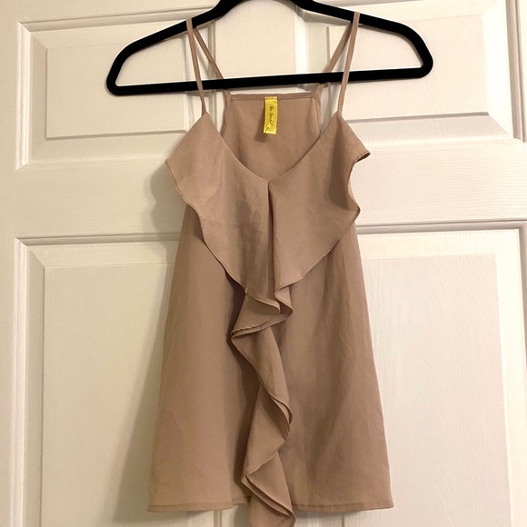 Size small. So flattering and pretty color. Looks cute tucked in or untucked. Bought from local boutique. Smoke and pet free home.
