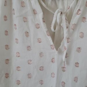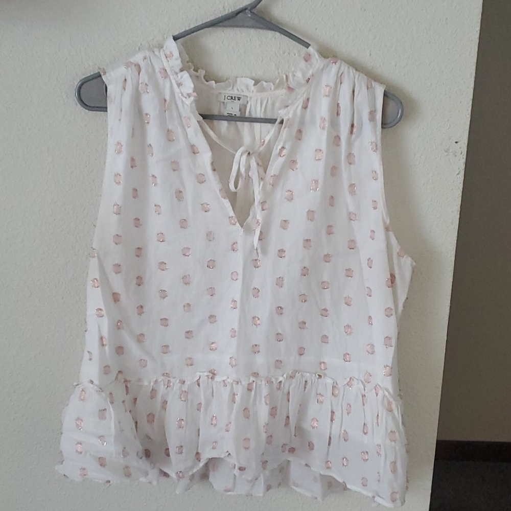 White tank with pink dots. V neck eith ruffle collar and tie