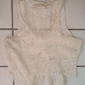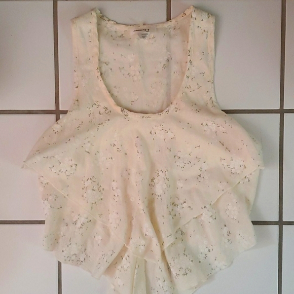 Cute Cream Colored Top White floral pattern Ruffle in Front No rips, tears or stains