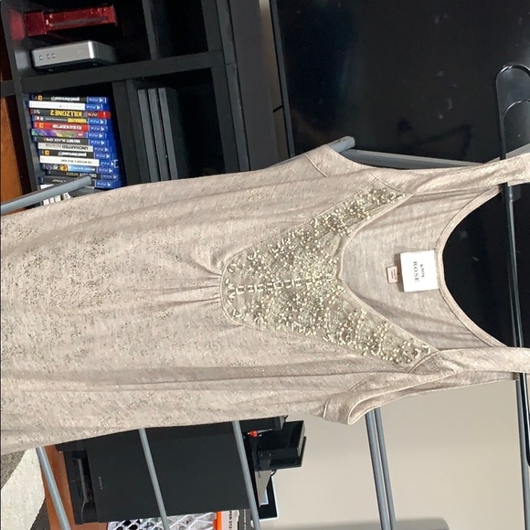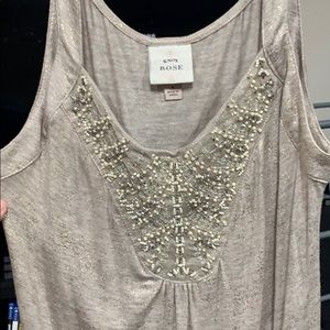 Gold tank top with embellished bead accents. Very light. Pairs well with dark jeans and a jacket. Size small, fits like small/medium.