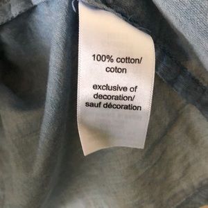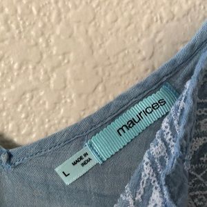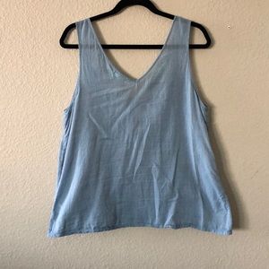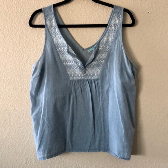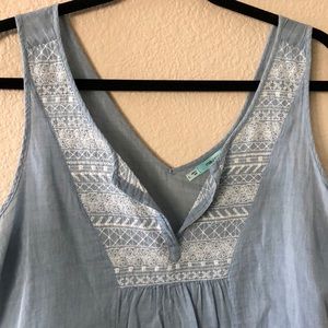 Cute tank with v neck and embroidered pattern around neck. Thin cool material. Denim color with softer texture