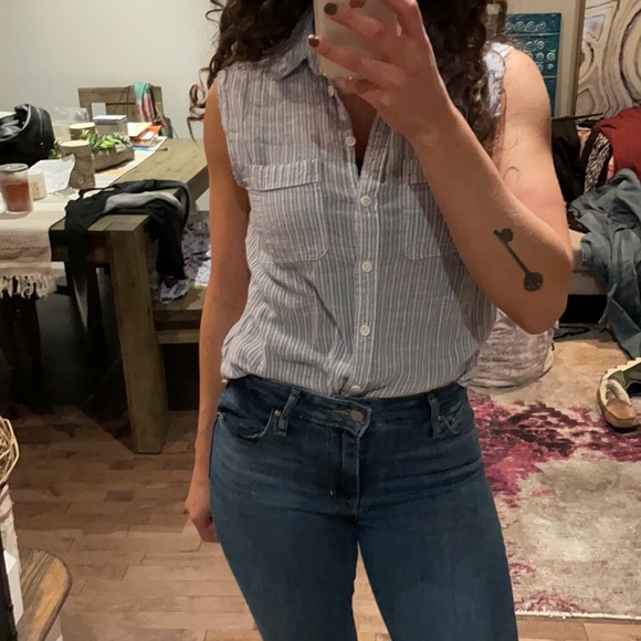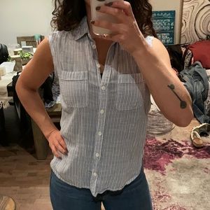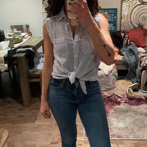 BDG button down tank; super lightweight and soft cotton; frayed sleeve opening, cute tied; light blue and white