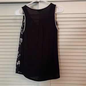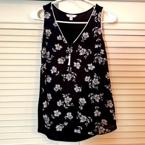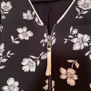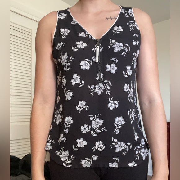 This lightweight tank is so comfy in the summer months, a very unique style with the zipper. Worn once as it was too small! The front is 100% polyester while the back is 95% rayon and 5% spandex.
