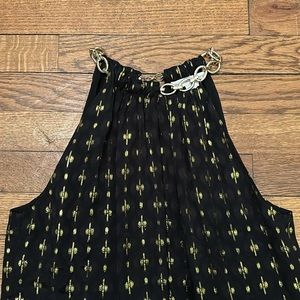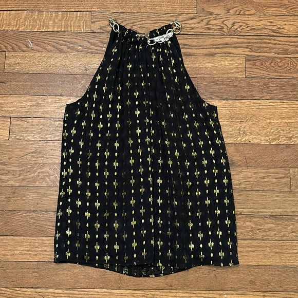 Chain neck design. Business casual top. 55% silk. 37% rayon. 8% metallic. Has inner layer of black, and outer layer with design.