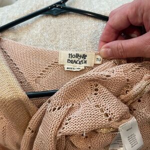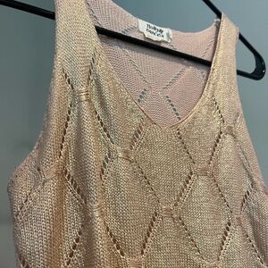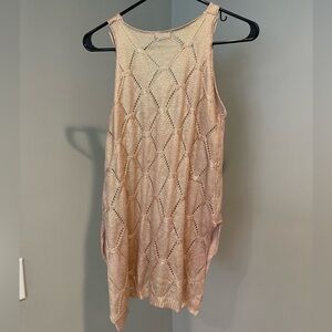 Beautiful shimmery tank! The color is like a peachy color with a gold undertone that shines in the light and sun. It is like a crochet top with the holes which looks so cute! The back is slightly longer than the front. The tag shows “TU” which appears to stand for one size fits all.