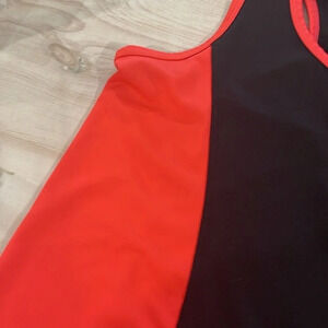Silky smooth tank in contrast colors. Zip at chest. Poly spandex. Stretchy. 15.5” across chest. 25” long. Tie for a cropped look.