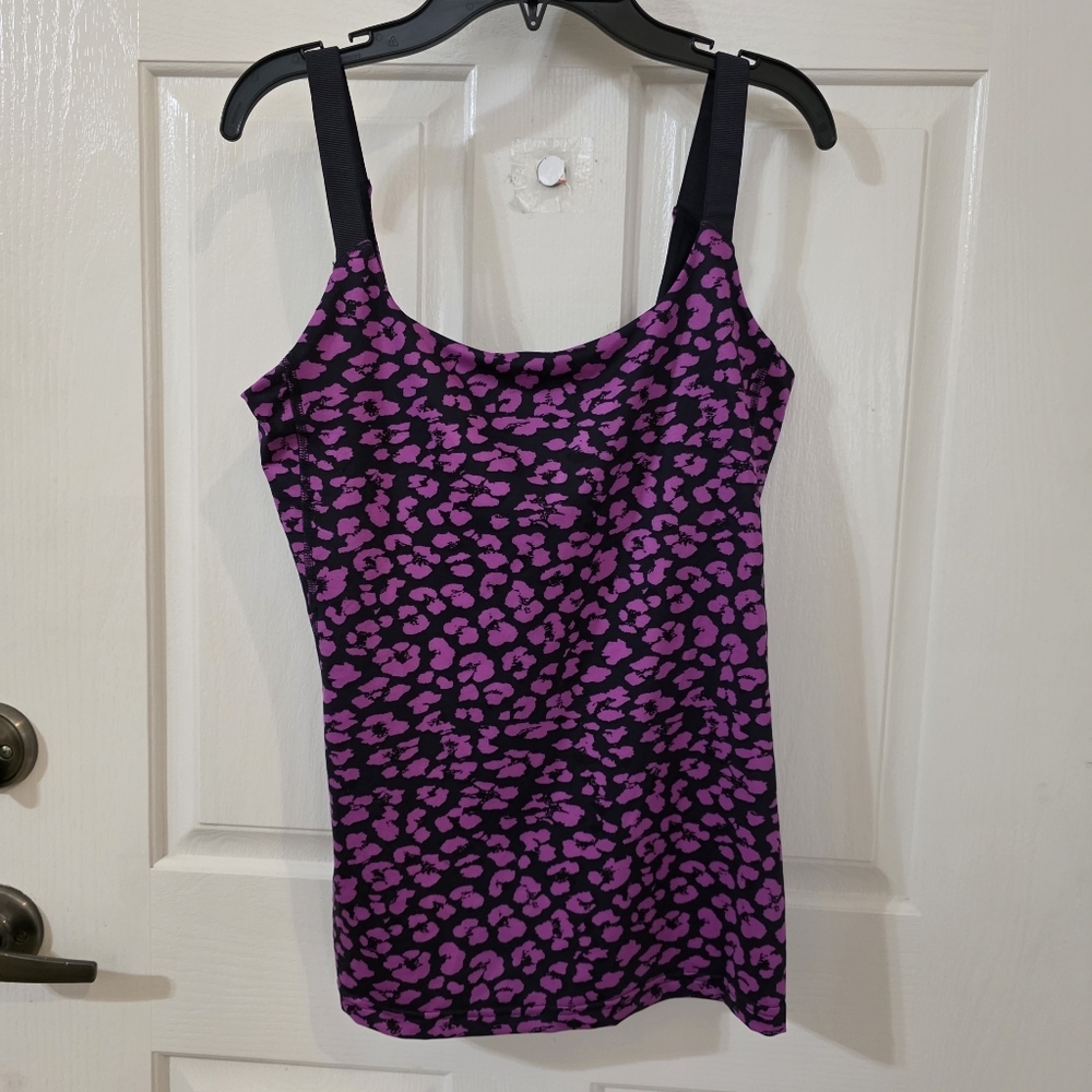Chic camisole with a vibrant purple leopard print on navy. Perfect for workouts or casual outings.