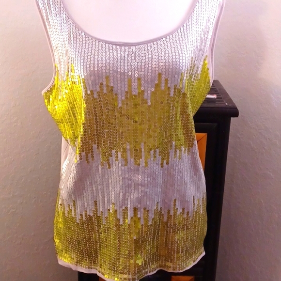 Style and Co. Petite Large tank in silver Grey with silver and green sequins on front. Comes from a smoke free home. Was in storage and I washed it therefore the tag came off. This was bought originally at Macy's. This will look funky with a nice pair of jeans.