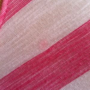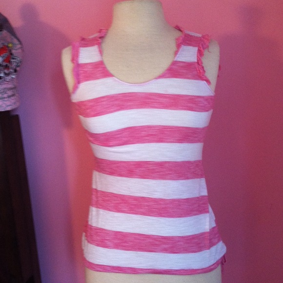 Pink and White stripes. Has a ruffle on each sleeve and on back of neckline. Has a small pink stain on one of the white stripes