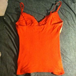 Red-orange tank top with lace on chest and bunches up at three lines down the front.