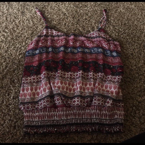A multi colored tank top with a mesh/stretchy bottom. Super comfy with a sheer feeling too it.