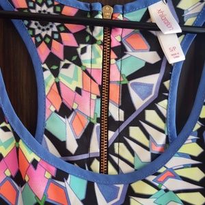 Light weight with zippered back and bright color print.