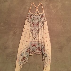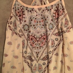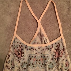 Vocal soft pink paisley rhinestone tank top with longer side for a more slimming look.