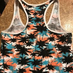 Multicolored, palm tree pattern tank top. Teal, peach (coral), black and white. Good condition.