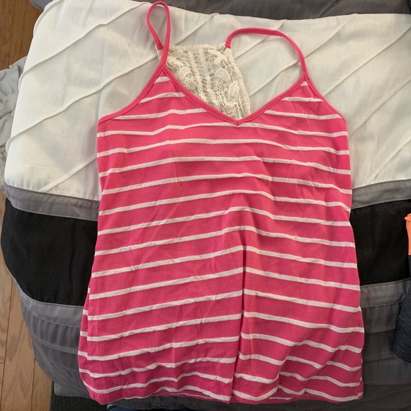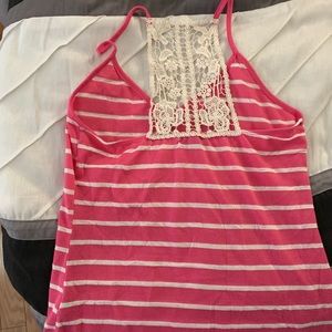Pink and white striped tank top. Lightly worn. Size medium. Lace detailing in the back.