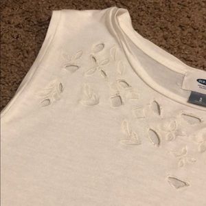 Small white tank top with embellishments around the collar