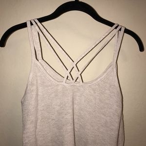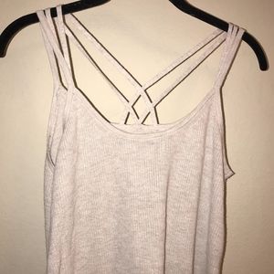 Super soft, flowy tan colored tank top from American Eagle. The straps cross across your chest.