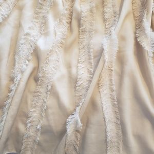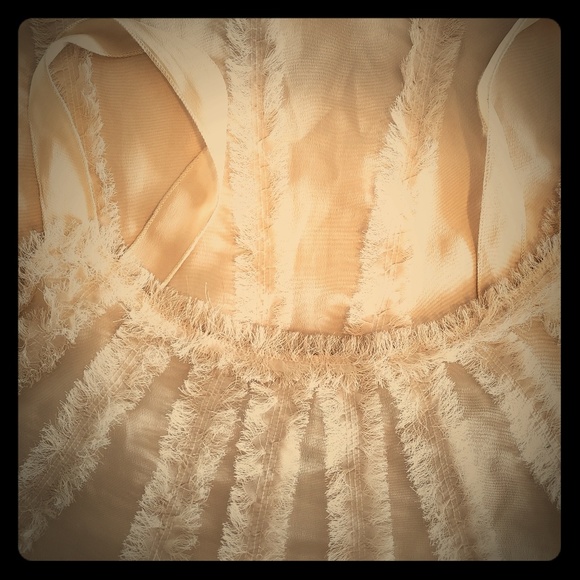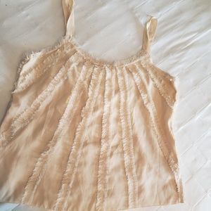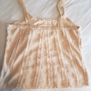 This "frilly" creamish tan tank top is SUPER cute. It looks great by itself or layered with a jacket or blazer.