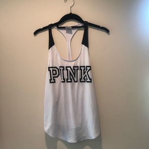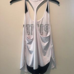 racerback tank top, white with black lettering, black trim on bottom and straps