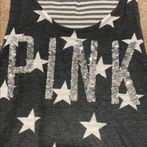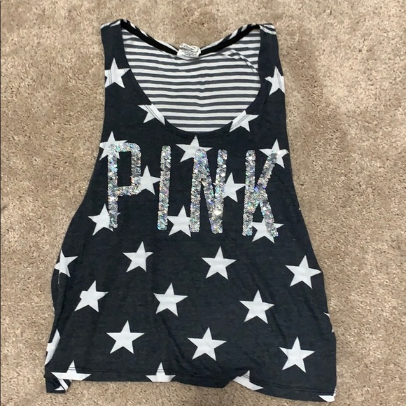 This is a Victoria’s Secret Pink tank Top. It features the word “pink” in silver sequins. The front had stars and the back has stripes. Worn a few times and in very good condition!