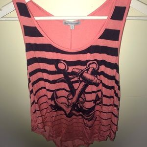 This top is colored coral with navy strips and a navy anchor design. The cover photo is the best to show the coloring of the navy! Sized medium, fits like it but is loose fitting. No rips, holes or stains. No trades.