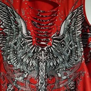 Screen print with wings and dagger also has wings in silver beads. Chest has several slits that reveal cleavage. It is a large but its a small large. It's never been worn it's in excellent condition.