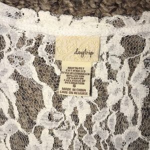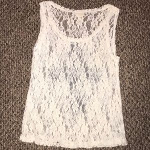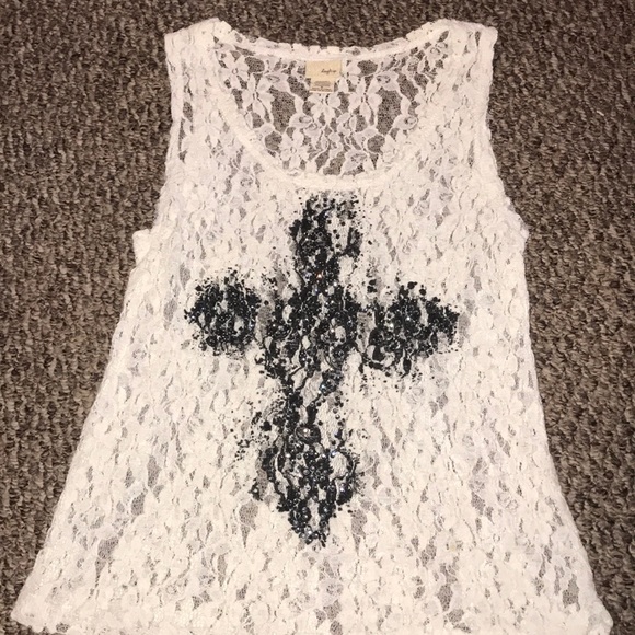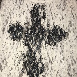Lacey see through with back lace for the cross, black little sparkly gems on the cross. I bought this from The Buckle.