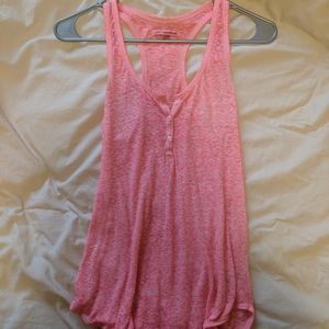 Bright pink. Loose fitting. Very good condition. Thin. Back is a little longer than front.