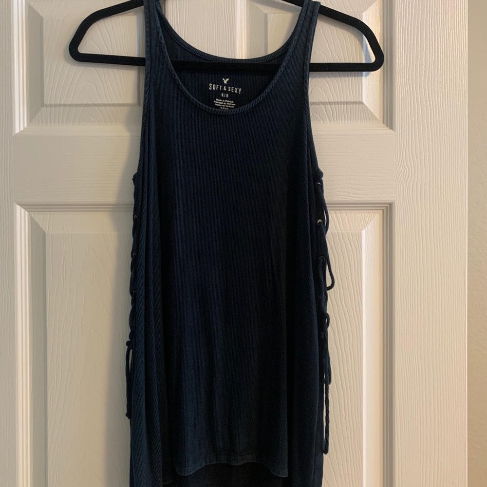 Navy Tank top with open sides that you can tie up. Loosen to reveal more or less