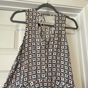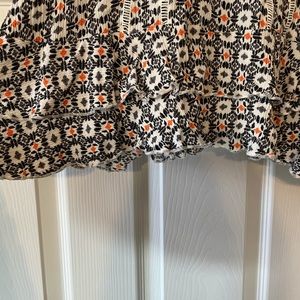 Colorful top with front detailing and ruffle bottom. Back also has a cute tie at the top