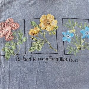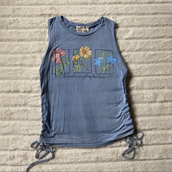 Drawstring tie/ruched side tank top. Reads, “Be kind to everything that lives.”