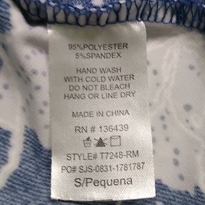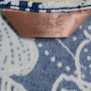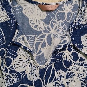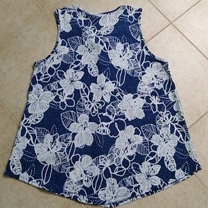 Cute blue and white tank. Flowy material. Measures approx 18 inches from armpit to armpit and approx 25 inches from neckline to bottom. Flower print. Ties at neckline or leave untied.