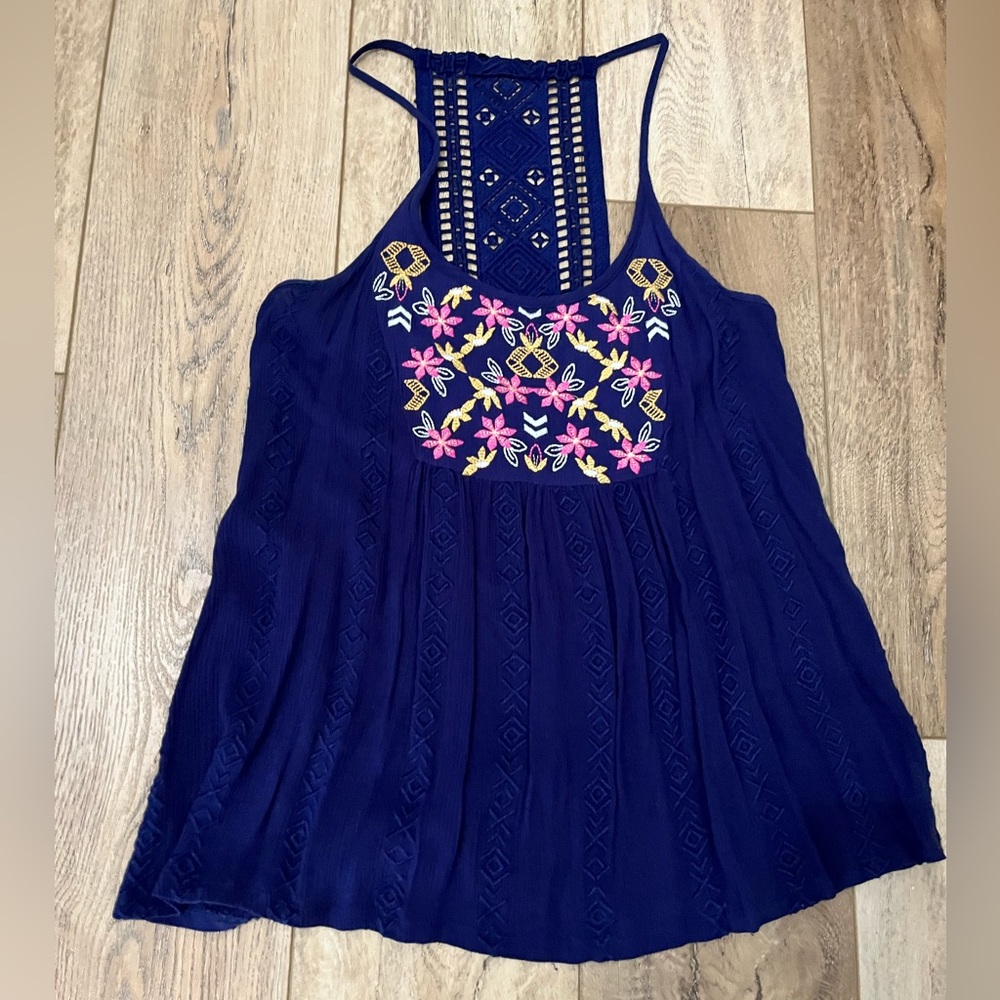 -Boho tank top -Flowy fit -Floral and blue -Crochet back