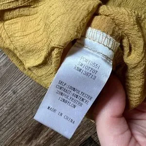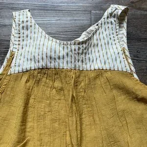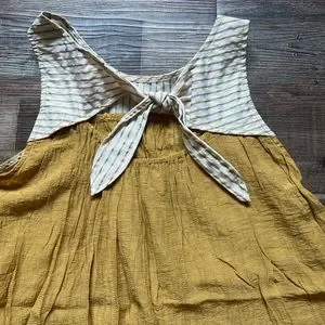Boutique, Doe, Rae, Designer, yellow, mustard, white, beige, women, womens, tank, top, shirt, summer, pattern, stripes, tie, sheer, key, hole, flows