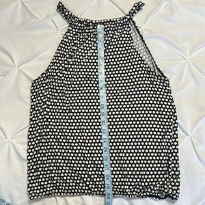Cute tank top with elastic hem. Material is stretchy and is meant to be loose around the waist. Minor armpit staining, see photos.