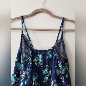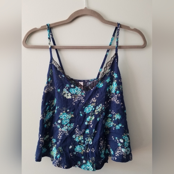 Decorative flowy cropped tank top. Dark blue with light blue, green, and white flower patterns. Black lace detail on v-neck neckline. Not adjustable.