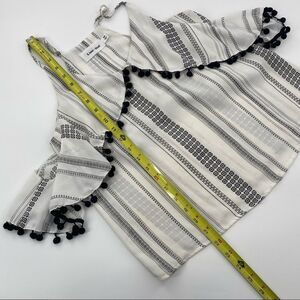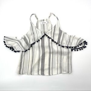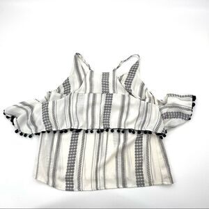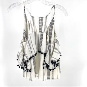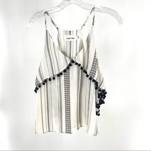 Line & Dot white and black camisole tank top blouse with adjustable straps and bobble accents. Needs a fresh dry cleaning to address make-up marks. Women's size XS - extra small. Please see photos for measurements and condition.